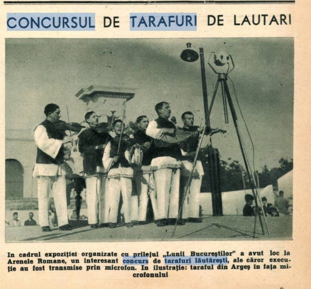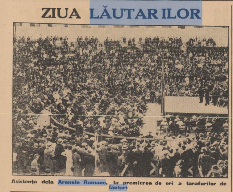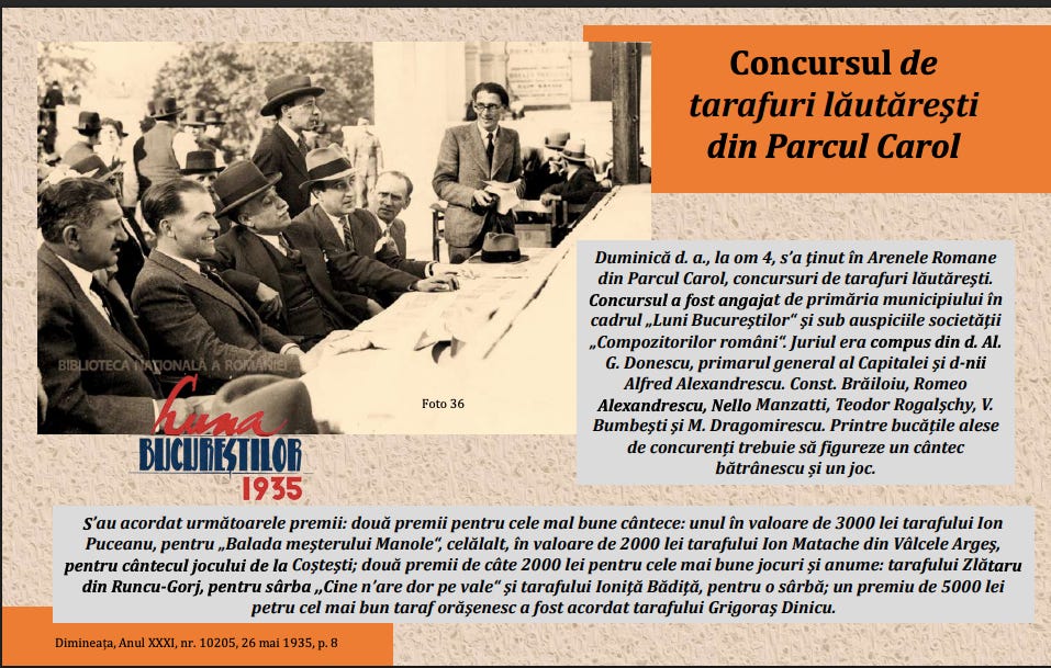 Era duminică, 25 mai, pe la orele 16:00, iar Parcul Carol era ticsit de lume. Toți se întreceau să ajungă la Arenele Romane unde aveau ocazia să vadă gratis cei mai buni lăutari din țară. Avea loc concursul de tarafuri lăutăreşti, angajat de primăria municipiului în cadrul „Lunii Bucureştilor”. În juriu, cu pălării și costume gangster style, erau în primul rând Al. G Donescu, primarul general al Capitalei și folcloristul Constantin Brăiloiu.